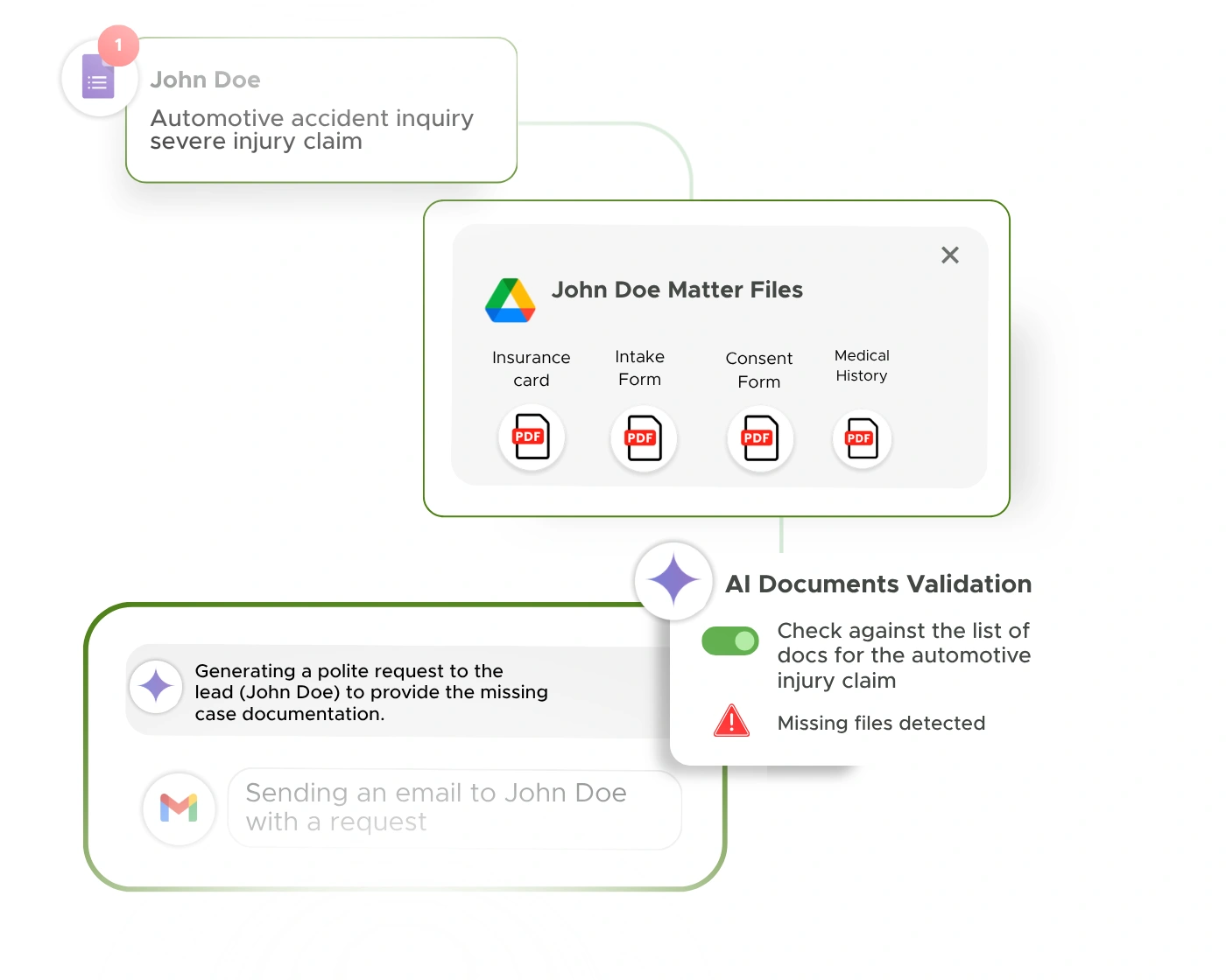 The most useful applications are not abstract. Firms are using AI to extract data from incoming documents, summarize files, validate whether required case materials are missing, generate repeatable legal documents, assign work more intelligently, and turn legal activity into better reporting. Zenphi helps connect those AI tasks to actual workflows so they lead to action, not just output.